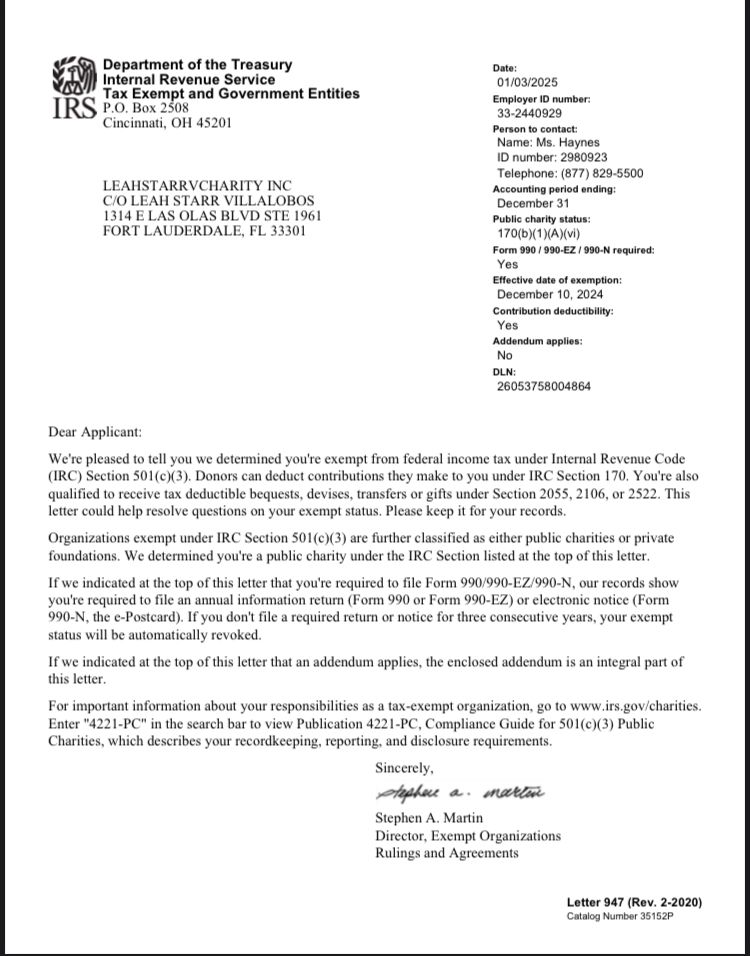 LeahStarrVCharity Inc. is a registered 501(c)(3) nonprofit organization. Donations are tax-deductible to the fullest extent allowed by law. View our IRS Determination Letter https://apps.irs.gov/app/eos/details/ or verify our status on the IRS website. .